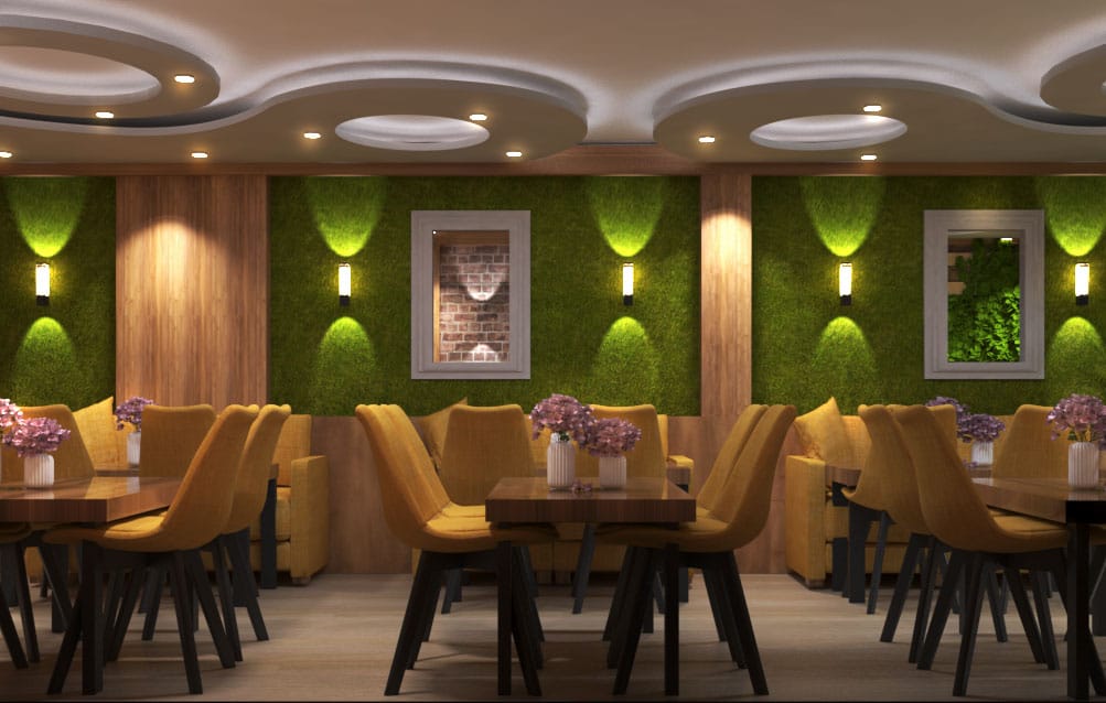 The café features elegant wooden tones paired with lush green wall accents that bring a refreshing, nature-inspired touch indoors. The soft, warm lighting adds a sense of calm, perfect for relaxing with friends, enjoying a quiet coffee, or even working on your laptop.